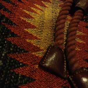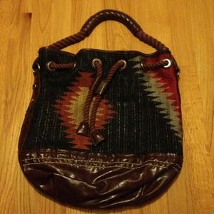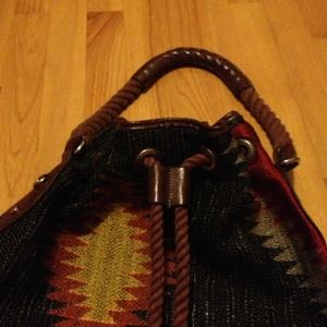 Aztec printed purse with faux leather bottom. Rope strap. Rope around top of purse can be pulled to close purse