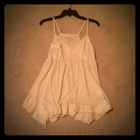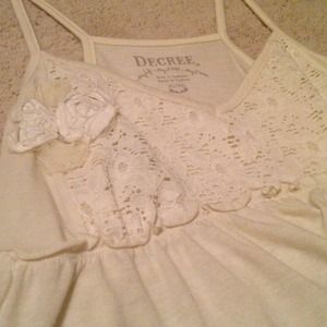 Cream-colored tank top. Big enough to look cute paired with leggings or skinny jeans. Lacey pattern and "lace" flower on the front.