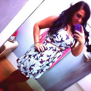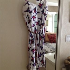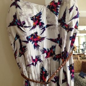 cute fun summer/spring white dress with bright colored birds and high waisted beige leather belt ! Says its a small but I'm normally a medium or large and it fit me !
