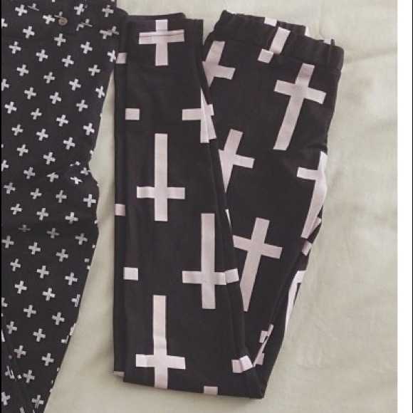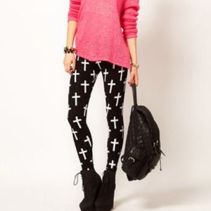 Black leggings with white printed crosses. Leggings has swimwear type material.