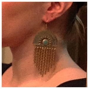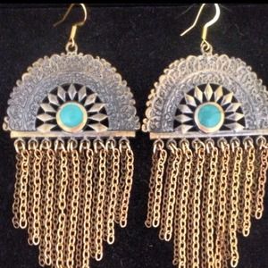 Handmade by me. Antique brass filigree finish with green stone. Gold & Brass Finish Chains hang. Longest at 2 1/2" long. One of a kind item. Original & unique.