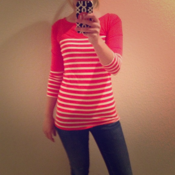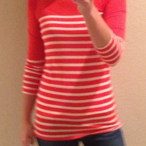 Vibrant flame/white stripe top. 3/4 sleeve, 100% modal material. Hits mid-butt on 5'4 frame. Light weight, good condition.