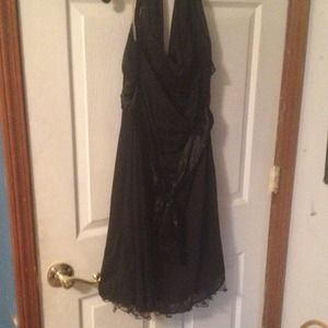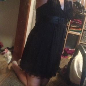 Comes about 4 inches above knees, Frilly underneath. It has a bow to tie around you and it's a halter top! Worn once for homecoming, good breast support. Too cute!