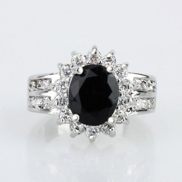 This is a classic round cut black gemstone decorated with stunning Austrian Crystals. It is a 18K white gold plated ring!!