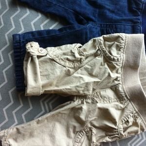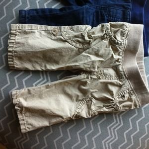 Size 3-6 months. Jean and khaki pants. Has hearts on the side. You can roll them up to make them as capris or long for just as regular pants.