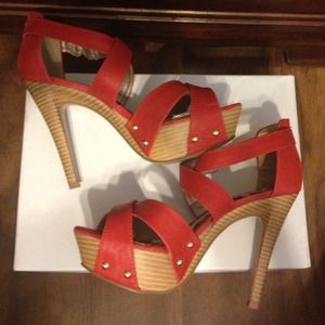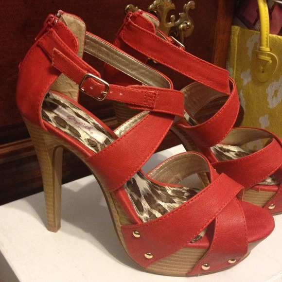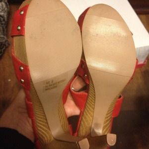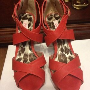 Worn once, wood appearance sole, red leather straps, cheetah print lining, in excellent condition