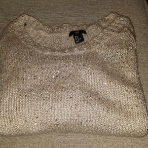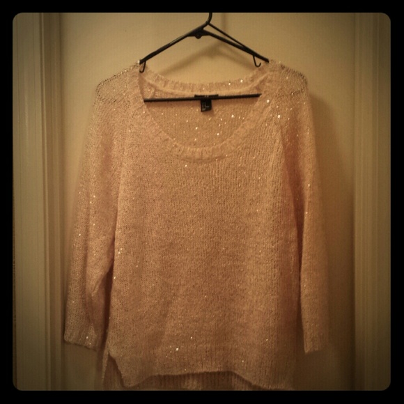 Pale pink oversized sweater with silver sequins sewn in. Three quarter length sleeves. Sweater is somewhat sheer but great for layering. Worn once