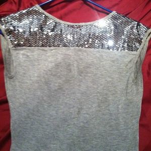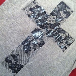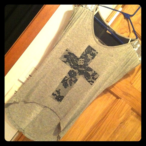 This gray high low shirt has a silver sequin back & shoulders with a gray lace cross! Super cute !