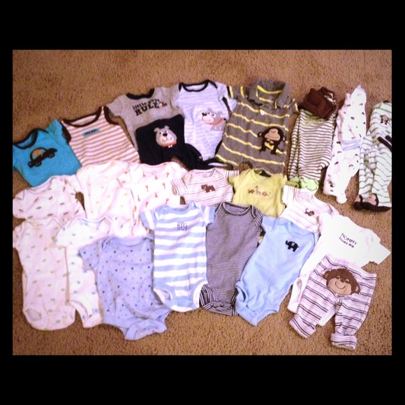 Not everything would fit in the picture but I have 53 onesies, 15 sleepers, 12 pairs of pants, 2 sets of bibs, & two pairs of shoes. Most of it was never worn. It's size newborn through 3-6 months. Most my son outgrew before he wore, but some was bought for me at my shower & I didn't like it... Stain free & from a smoke free home! Price is firm, I do accept paypal! :)