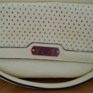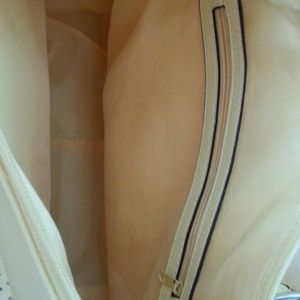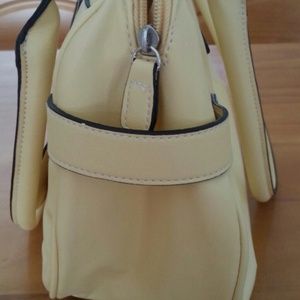 This purse is a beautiful pale butter yellow with black outlines and white stitching. The pocket on the front snaps closed. There is one zipper pouch on the inside of the purse.