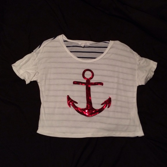 You'll be saying "ahoy" with this crop too! Complete with a red, sequined, anchor and blue stripes, this top is perfect for going out!