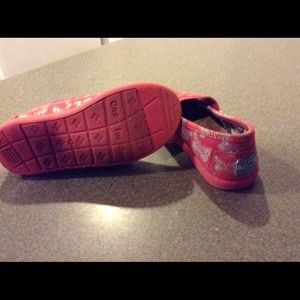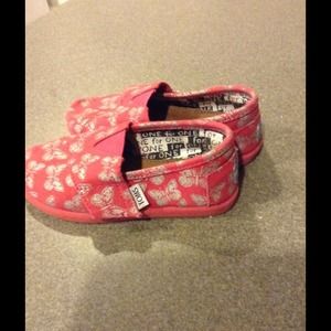 Cute red with silver butterfly's Toms shoes. My little girl wore these maybe twice. They are too small for her now and need a new home! From a smoke/pet free home!
