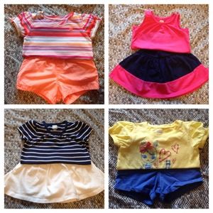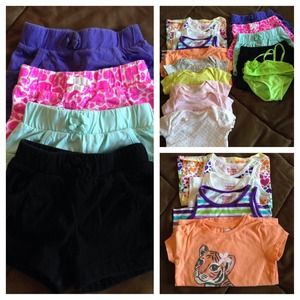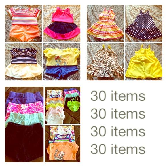 @saucy1 The first collage; the two pair of shorts are a 2t and the skirts are a 18-24 months and the tops are a 2t. The second collage; The rainbow dress is 12-18 months, the navy and white is 1 1/2yrs- 2yrs, and the yellow one as well as the brown and ivory one is 12-18months. Last collage Clothing tops 2t and one top is a 12months shorts are 4t & Under shirts are 6-12 month