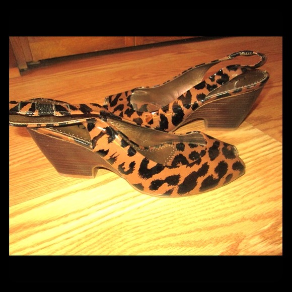 This is a cheetah print peep toe mini wedge. It was worn once, so it is in great shape. Heel is wooden, and there is a back strap. 3" heel.