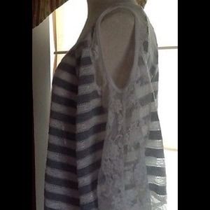 When it comes to casually cool Tops that are also fashionably trendy, throw on this unique top by Entry. Perforated stripe and lace design. Scoop neck. Contemporary fit. Bat sleeve, cut out accents at shoulders. 40% Cotton, 60% Polyester. Gently loved, excellent condition. Retail Price: $35.00.