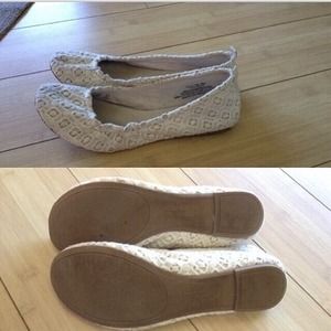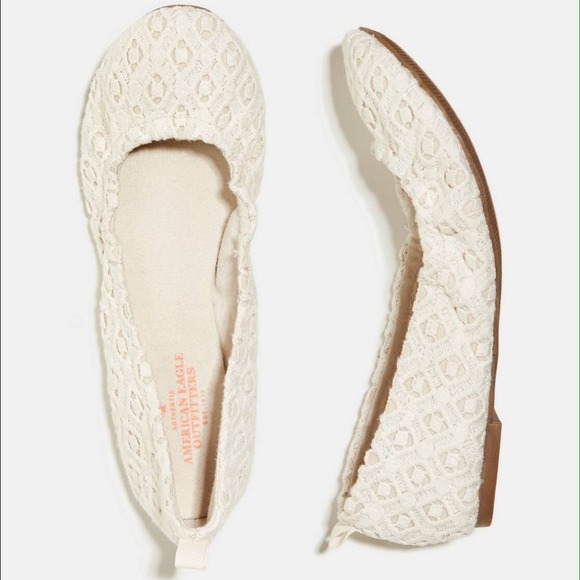 American eagle white flats. Size 8 but can fit a 7.5. Good condition, but i made the mistake of wearing black socks with them and now the inside is black. That's really the only flaw. Super cute with a pair of skinny jeans! NO TRADES!