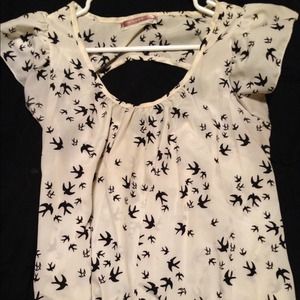 Three summer blouses for a low price. The black see through leaf blouse has a zipper in the front that is stuck and is a X large but fits like a medium/large. The turquoise blouse is see through in perfect condition, size L fits like a medium. The white blouse with birds has a pretty hole in the back and is a size L. Enjoy!!