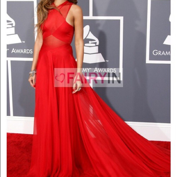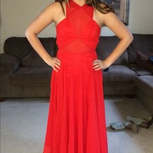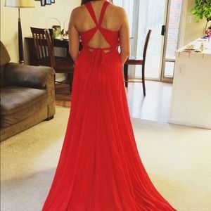 Never worn. Red sheer prom dress. Open back. Train. Size 6. Will post a picture of me in it of need to. Price can be lowered! I just want to sell this dress ASAP!!