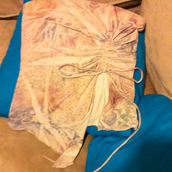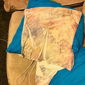 Tan printed design asymmetrical tube top ties on left side. Looks great for a night out!