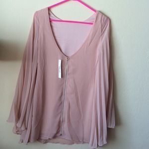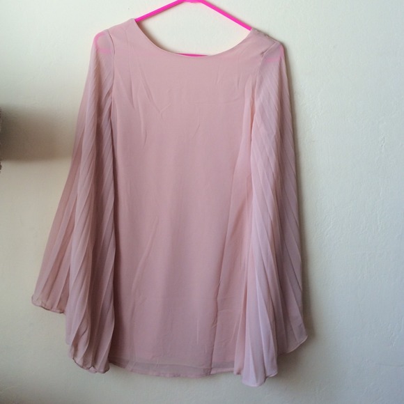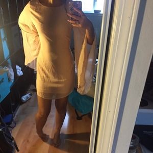 This is a beautiful nude colored dress with pleated angel sleeves and a low back. The zipper goes all the way down the back of the dress. Never worn.