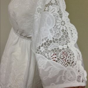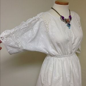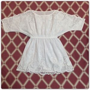 Beautiful white cutout embroidered mini summer dress. The dress has elastic waist and can be worn as a mini dress or tunic. Top is loose fitting batwing top. Measurements are top to bottom full length 31", bust loose batwing style, waist 13" ( elastic waist extends) from waist down 16".