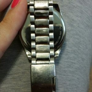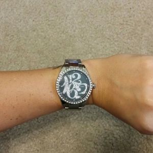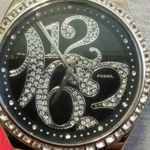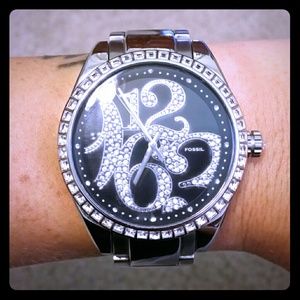 Large boyfriend style women's watch. Silver band with removable links. Large black face covered in bling. No missing or cracked stones at all. The band does show wear from daily use however it is not very noticeable when worn. No scratches on face. Needs standard watch battery. I have an extensive fossil watch collection. All of my watches have been kept in a watch box when not worn. I just need to downsize :)