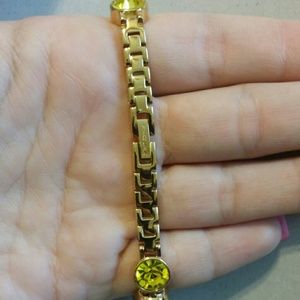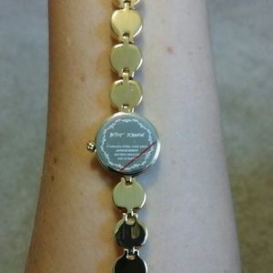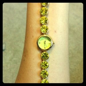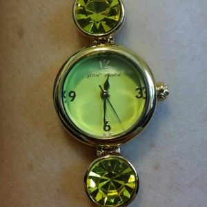 This is a petite Betsey Johnson watch. It has a gold band with neon yellow/lime stones. It has never been worn, as you can see the sticker hasn't even been removed from the back. It is flawless. It does need a battery.