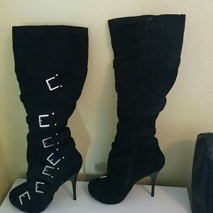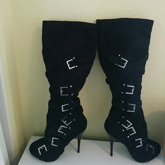 @olechka77 Heel Height: 5 in. Platform Height: 1 in. Shaft: 17 1 ⁄ 2 in. And yes there is a little elastic on the inside of the boot to allow it to stretch a little.