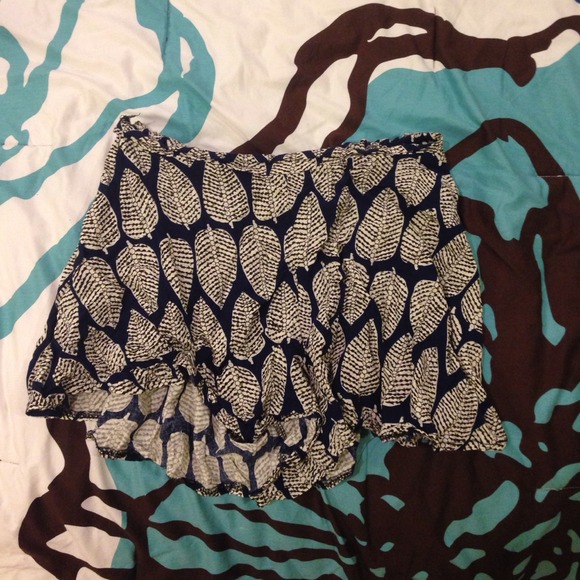 They look almost like a skirt but they are shorts! Worn once but a little too short for me! Elastic waistband and leaf pattern is beige and the background is navy blue