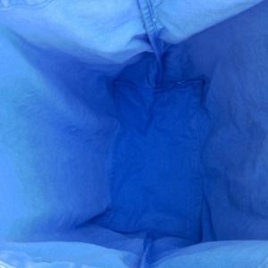 The silver peace sign is starting to wear off a smidge but the bag it's self is still in good condition. It has no pockets on the inside but with no pockets that means you have more room for clothes or books!