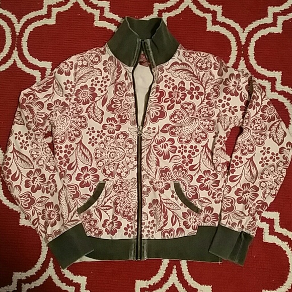Zip up collared jacked with deep red floral pattern and gray accents at the sleeves and collar. Great condition.