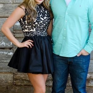 Black and white lace embellishment at top of the dress + high neck + Black and white crystals separating top and bottom + Black bottom + Thigh length