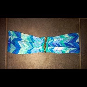 H&M Blue Bikini Top. Bandeau style. Gold small zipper in the front that closes the top. Tag says US 4. Will best fit A/B cup, XS or S. NWOT