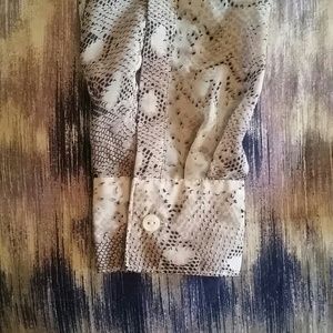 Chiffon snakeskin printed top with chartreuse piping around collar and down buttons