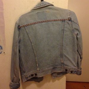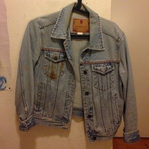 A few stains, It was my first denim jacket ever. Fits Small/Medium/large