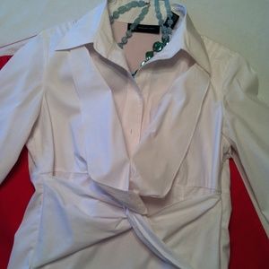 Standard white blouse with a stylish twist of material in the front. Sets it apart in a fun way! Excellent condition. Cotton, polyester, spandex.