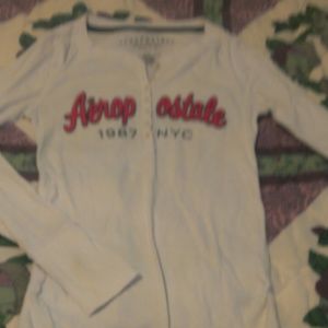 White with pink on navy blue lettering, Long sleeve, size large. The lighting is causing the shirt to look ''dirty'' or stained, but it has been worn only once and has no stains, tears, or holes. Shirt is very clean and white.