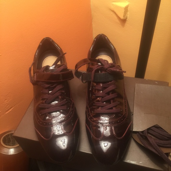 Gently worn , excellent condition 100% authentic Burgundy patent leather Louis Vuitton sneakers comes dust bag and original packaging sorry extra shoe laces not included somehow I've misplaced them !