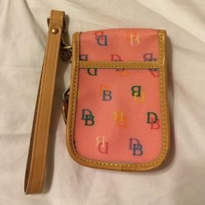 Super cute pink/multi-colored Dooney & Bourke mini purse/clutch. Leather trimmed with removable wrist strap. Cell phone pocket on back. Perfect condition.