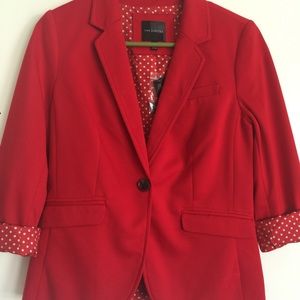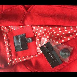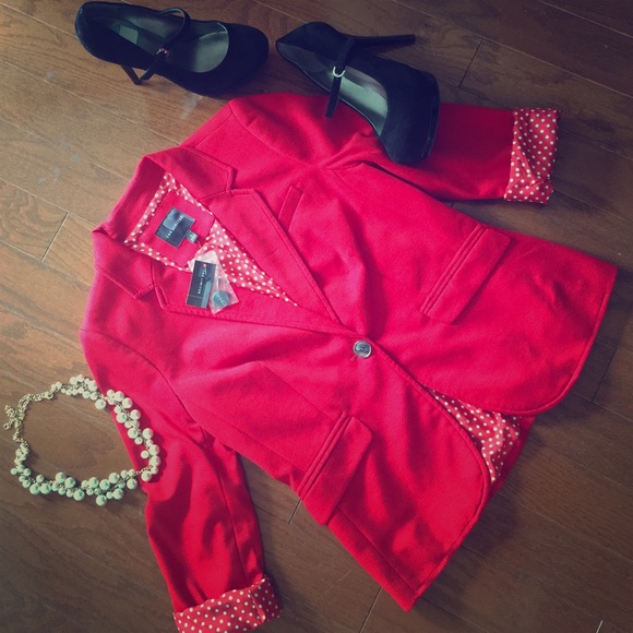 This red hot jacket features an adorable white and red polka dot lining which can be seen when rolling sleeves for a modern look that gives it extra sass! NWT never worn, mint condition! Extra button included.