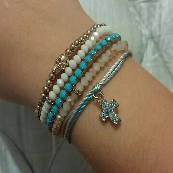 FINAL DISCOUNT!!! Gold beaded bracelet has a skull, and the cross string bracelet has an adjustable chain depending on how tight/ loose you want it! The other bracelets are just stretchy. Super cute and great colors together