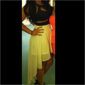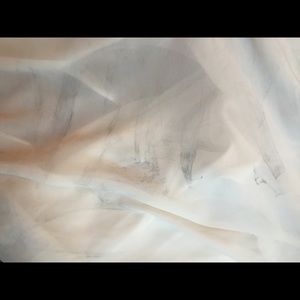 White and black high low dress. Worn a few times but still in great condition. Some stains on the back near the zipper and a little on the side. Not sure what from. Not really noticeable unless pointed out. I'm sure if taken to a dry cleaner will come out.
