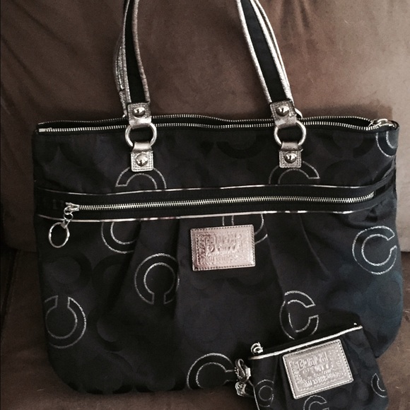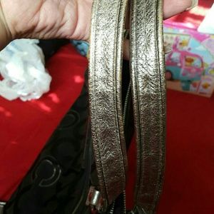 Great used condition. Black interior. Matching wristlet has a bit of wear on the silver lining
