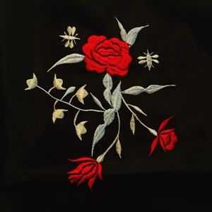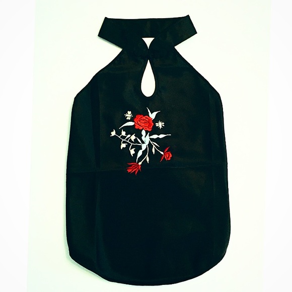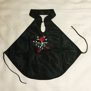 Amazingly beautiful satin halter top with embroidered roses and bees on the front. Ties in back with two delicate strings. The collar is 16" around and closes with a pretty detailed Chinese button knot. There are no tags related to size or brand. The top measures 17" in length and 22" across (from one string tie to the other).