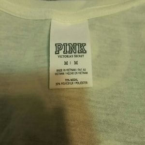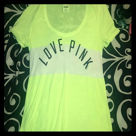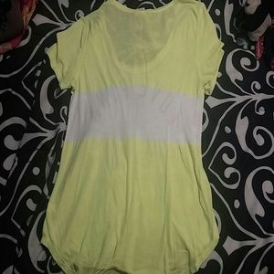 Scoop neck design, the bottom of the shirt is also not straight across like usual its a little longer in the middle and short on the sides to cover your butt a little. The color is more like the first pic its super bright yellow.