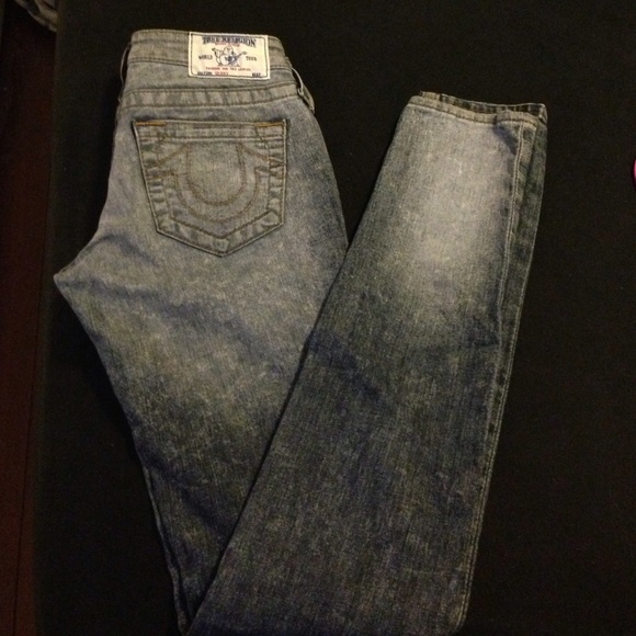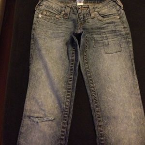 True Religion Stretch, skinny distressed blue jeans with distressed knee. Very comfy Great condition.