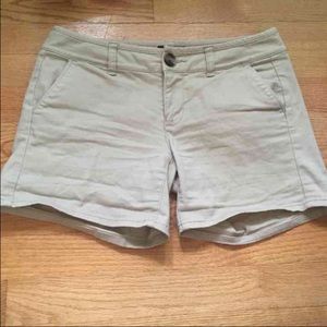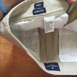 aeo midi stretch khaki shorts size 0. These shorts have been worn about 2 or 3 times last year and are in great condition! These shorts can be rolled up or down(first and last picture) so the length is kind of adjustable!