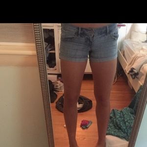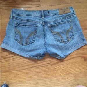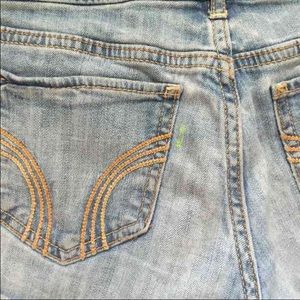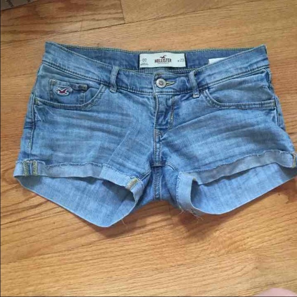 hollister light wash shorts size 00. have a small flaw on the back, the green puffy paint but the price reflects it and it's really not noticeable when wearing. Have only worn these a couple of times and they are still in great condition!