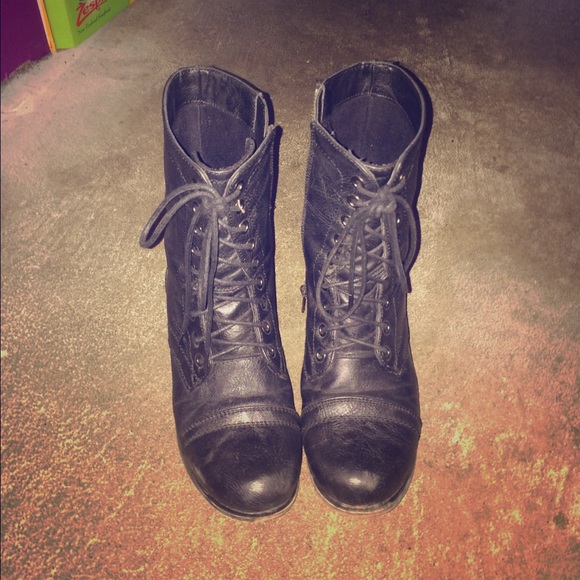 black. adjustable. very cute with skirts or jeans. nothing wrong with them, just worn and a bit dirty.
