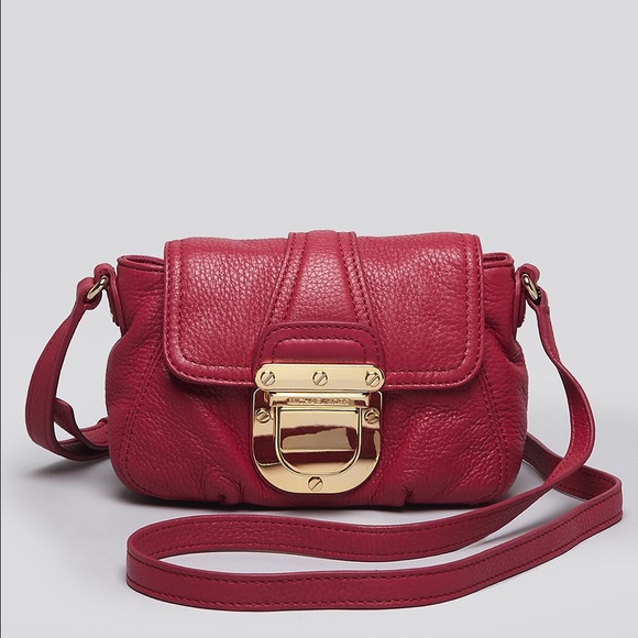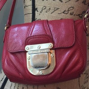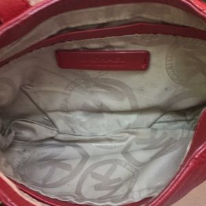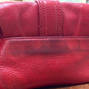 3rd Picture Update: I worked on the stain and it's a little better I think. (Leather cleaner). This cute little cross body is in used condition. While the buckle does show wear, the leather is soft and supple with some dark marks on the back-I believe they are from rubbing on new denim jeans. (You can remove the stains with rubbing alcohol.) The interior shows average wear. Give this bag a second chance at life!